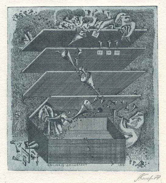 Editor: This is Oleksandr Aksinin's "Apocalypse" from 1983, a print using engraving techniques. The fine lines and the almost medieval imagery create a feeling of doom and foreboding. How do you approach interpreting something with this much detail and apparent symbolism? Curator: I see a careful laboring of the image, evident in the density of the engraved lines. The choice of printmaking—a medium often associated with reproducibility and dissemination—suggests that the artist is perhaps commenting on the broad distribution of such apocalyptic anxieties in contemporary society. The meticulous, almost obsessive, quality of the mark-making, also visible, indicates not just skill but also an intense engagement with the material process itself. What's your take on the diamond shape of the image? Editor: I noticed that shape too. The figures are reminiscent of the crucifixion and a gathering of mythical figures beneath the cross. It's like a snapshot of history, distorted and dreamlike, and the diamond shape makes me feel slightly off-kilter. Does the form have some cultural significance related to production, or social consumption perhaps? Curator: Absolutely. Consider how the formal elements amplify its symbolic resonance. The frame itself could evoke a playing card, as if destiny is dealt. Considering that this piece was made in 1983, towards the end of the Soviet period in Ukraine, could the material and production of graphic art - accessible but censored - reflect Aksinin's social commentary and critique through coded, symbolic gestures? Editor: That makes sense. The accessibility of prints allowed Aksinin to circulate these ideas in a way other mediums might not have. It brings new weight to the images themselves as objects and ideas. I wouldn't have thought about the Soviet context if you hadn't pointed it out! Curator: Considering how the social conditions surrounding the production influenced the choice of materials can give us great insight. Editor: Thank you. I now see how crucial it is to consider both the material creation of the artwork and the environment it comes from to unveil its true meaning.