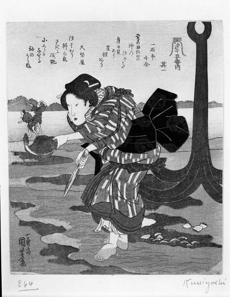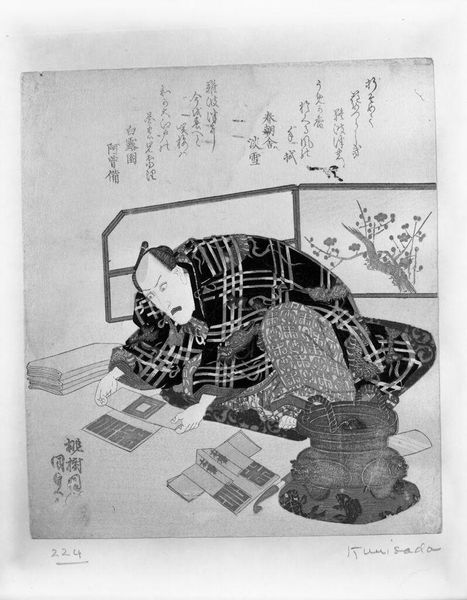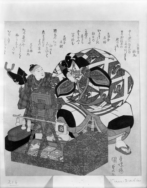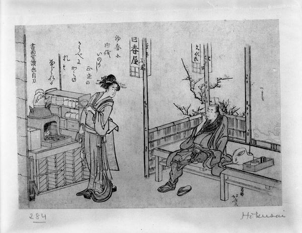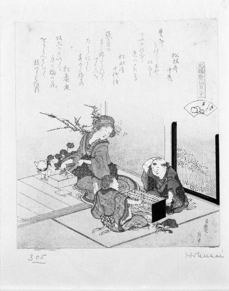Editor: This print, by Hokusai, shows two women making rice candy and is part of a series called "Shell-Matching Game with Genroku Poets." It feels incredibly intimate, like a stolen moment. What do you see in it? Curator: I see a quiet, domestic scene infused with subtle symbolism. The women's activity, preparing sweets, speaks to tradition and connection, while the objects around them hint at cultural rituals and seasonal celebrations. It’s as if Hokusai is inviting us into their world, doesn’t it? Editor: It does. It's like glimpsing a secret. I'm struck by how much detail he includes. Curator: Absolutely! He captures not just the scene, but a feeling, a sense of time. A moment of shared activity that feels so human.