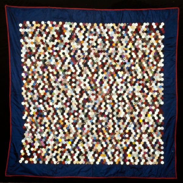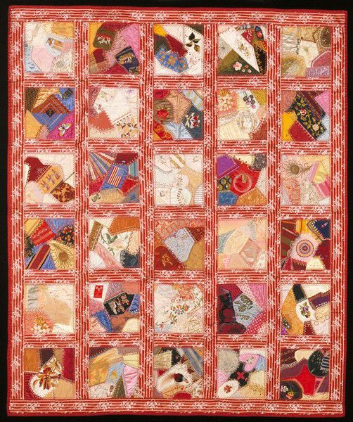 This Crazy Quilt was made in the United States around 1892 by an anonymous artist, using silk, velvet, wool, and embroidery. The quilt, with its seemingly random assembly of varied materials, reflects a broader shift toward individual expression within the domestic sphere. During the late 19th century, the Victorian era emphasized ornate decoration and elaborate displays of wealth and status. Quilting became a popular pastime for women of varying social classes. This particular quilt, with its use of expensive fabrics and intricate embroidery, suggests it was created by a woman of means. The "crazy" pattern, while appearing haphazard, allowed for creativity and the incorporation of sentimental scraps of fabric. Quilts, beyond their functional purpose, became visual records of personal histories and social connections. To understand this quilt better, we might consult historical archives, women's magazines, and textile collections. These resources help us interpret the significance of its materials and techniques within the context of Victorian society.