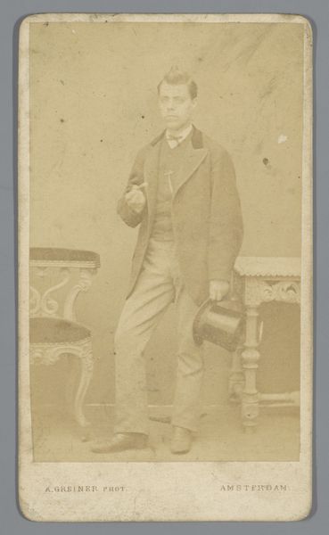 Curator: Let's examine this photograph titled, "Portret van een onbekende jongen naast een stoel," created between 1877 and 1897 by Lodewijk Hendrikus Serré. It's a gelatin silver print showcasing the portrait style and leans towards realism. Editor: The first thing that strikes me is the austerity of the image, and also a vulnerability. There is the contrast of the rough-spun suit of the subject with the elegant chair and trim. Curator: The young boy's attire—the suit—suggests a specific class position, doesn’t it? Considering the late 19th century, there is almost a performative element to this presentation. How do you see the construction of identity playing out here? This era coincides with increased visibility of male youth within a changing social and economic framework. Editor: For me, the question becomes one of production. The gelatine-silver print suggests standardized manufacturing. This, as well as his relatively commonplace suit, all point to an emergent material reality for the upwardly mobile at the time. Curator: That chair too. It serves as a prop in constructing an image of cultivated domesticity. What does the relationship between labor, production, and social ascension tell us here? Editor: I think this portrait suggests access and aspiration. Here’s an item of furniture reproduced by machines being utilized for the social mobility and posturing of a person also possibly in search of stability and access in the changing economic landscapes of the era. Curator: This makes me think about how portraiture serves as a critical site for studying not only the rise of capitalism but also, increasingly diversified audiences and shifting societal expectations for youth. How were they expected to perform? How does this reflect contemporary anxieties and desires surrounding adolescence? Editor: Well, the image, crafted using a specific, commercially accessible process speaks to an industrialised, reproducible world. As opposed to the pre-industrial days. This medium suggests photography itself was becoming a consumer product. The rise of its accessibility surely marks its shift in society. Curator: Examining images like Serré's photograph can lead to thinking about shifting values surrounding family, class, and burgeoning consumer culture that transformed self-perception and presentation. Editor: Absolutely. It leaves me contemplating photography's evolution alongside wider societal shifts.