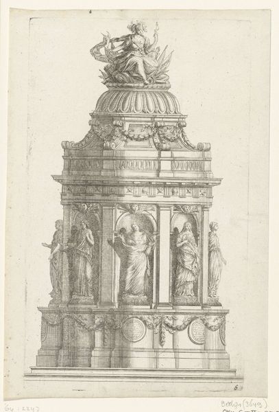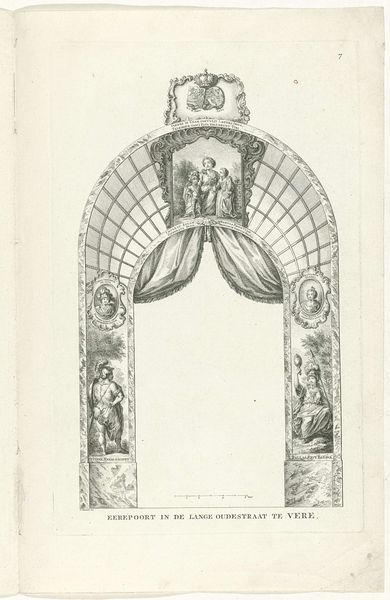 Curator: This is an engraving titled "Erepoort aan de haven" or "Triumphal Arch at the Harbor," dating back to 1751, by Caspar Jacobsz. Philips. Editor: Oh, it's quite lovely! It feels like a blueprint for a parade float. It’s light, airy, but… intensely detailed, like someone meticulously planned out a dream. Curator: Precisely. Consider the architectural structure—the strong, definitive lines form a clear frame. Philips uses the engraving medium to its full potential, creating contrasts between dense shading and areas of stark white. Editor: I’m drawn to the characters… the Neptune figure with his trident seems a little out of place with the cherubic figures riding the… hippocamps? They almost appear to be lifted from two completely different worlds. Or perhaps a slightly surreal dream? Curator: The amalgamation is intended. We're looking at a clear application of Baroque aesthetics: theatricality combined with meticulous detail. See how the composition employs iconography that conveys a celebration of maritime power, using both classical allusions and contemporary symbolism. Editor: You are so right! All that regal bearing – it hides some serious muscular detail… And did you notice all the little crowns? Look how many times they feature in the coats-of-arms lining the sides – there must be so many levels of authority on display! Curator: Indeed. These elements signify status, prestige and civic pride, speaking directly to the print’s purpose in commemorating maritime achievement. Editor: What's intriguing to me, though, is that despite the obviously celebratory function and detailed renderings, there’s an unfinished air to the whole composition... a certain lack of grounded-ness, if you will... It reminds me a bit of those unfinished Piranesi etchings, perhaps it is intentional. Curator: That effect adds another dimension to the viewing experience: prompting viewers to engage and to, in essence, “complete” the narrative suggested by Philips’ intricate visual cues. It invites reflection not only on historical power dynamics but the broader narrative of our interpretation and relationship to such iconography. Editor: All told, not just an image but a key into a past – part reality, part ambition – envisioned for an age now past. Curator: Yes, Philips’ print operates beyond simple documentation – offering a complex, layered vision.