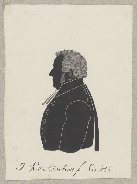 Pieter Barbiers IV created this silhouette portrait of Petrus Jas. The composition is strikingly simple. The stark contrast between the black silhouette and the neutral background immediately grabs our attention. Barbiers masterfully uses line to define Jas's profile, capturing the texture of his hair and the cut of his clothing with impressive economy. The lack of color or shading pushes us to focus on the pure form and the underlying structure of the image. In a world where portraiture often aimed to capture the individual's essence, this silhouette flattens the subject, turning him into a sign, an emblem. We are left contemplating not the man, but the image itself, a play of positive and negative space that raises questions about representation and identity. The signature and inscription add to this semiotic game, further emphasizing the constructed nature of the image and the complex interplay between art, identity, and representation.