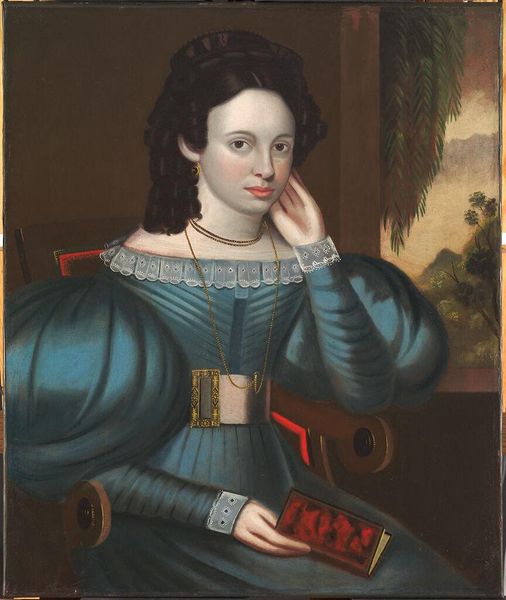 Erastus Salisbury Field painted "Woman Holding a Book" with oil on canvas. The composition is strikingly symmetrical, grounding the subject in a pose of reserved formality. The woman’s gaze is direct, engaging the viewer with an almost confrontational honesty, while her book suggests intellect and literacy. Field’s technical approach emphasizes linearity, defining forms with clear, precise outlines rather than blending tones. The ruff collar, rendered in meticulous detail, contrasts with the darker, less defined dress, drawing attention to the face as the focal point. The book itself, held delicately in her hand, acts as a signifier of her status and education, which challenges conventional roles. Note how the austere palette and controlled brushwork underscore the sitter’s composed demeanor, reflecting a cultural emphasis on restraint and virtue. This portrait destabilizes simple readings of gender and identity, suggesting a complex interplay between representation and reality.
