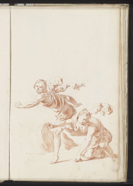 Editor: This is "Copy after the Figurine" by Salvator Rosa, a print from the 17th century. The figures seem to be emerging from the ground. What strikes you about this work? Curator: I see a carefully constructed performance of labor. Rosa, the artist, is crafting an image of supposed spontaneity, yet the etching reveals the deliberate action of the hand, the labor involved. We are left to consider the cultural context of printmaking itself. Editor: So, you are more interested in the labor that created the print rather than the scene depicted? Curator: Precisely! What kind of tools were necessary to create this kind of work and how were they made? The focus on the material existence of this piece brings up interesting questions about labor and value. Editor: It's fascinating to think about the materials and processes behind the image itself. Thanks for sharing your perspective! Curator: And thank you for prompting a deeper look at the material production of this etching.