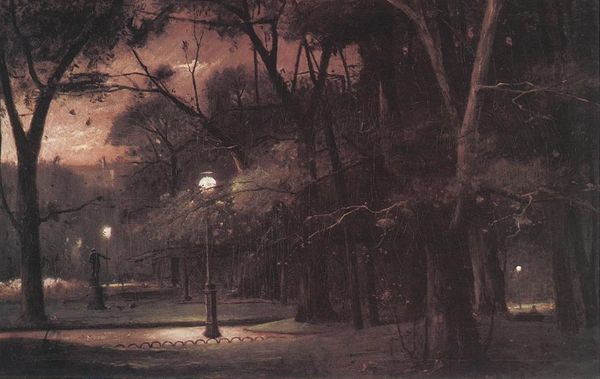 Ladislav Mednyánszky painted this evocative landscape, sometime between 1852 and 1919, capturing a haunting and subdued scene. The painting is rendered in muted tones, where the skeletal trees reach towards a pale, obscured sky. Mednyánszky, a Hungarian artist, often explored themes of isolation and melancholy in his work, themes that were especially heightened because of his own identity as a Baron who chose to live amongst the lower classes. His approach provides commentary on class divisions. The lone campfire in the distance suggests a human presence, while the overall atmosphere evokes a sense of quiet contemplation. Mednyánszky’s choice to portray the landscape in such a somber light might reflect the socio-political unrest of his time, with its own implications for class, identity, and belonging. The painting’s emotional depth invites us to consider the relationship between the individual and the environment, and the transient nature of existence.