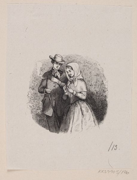 Curator: This is "De sladrende koner", or "The Gossiping Women," an etching made around 1880 by the Danish artist Carl Bloch, now held in the collection of the SMK, the Statens Museum for Kunst. Editor: My first thought? "Intrigue!" You can just *feel* the secrets being exchanged. The almost frantic way one woman leans in, the basket dangling from her arm, adds such a comical intensity. Curator: Absolutely. Consider the printmaking process: etching allows for such detailed line work, which is crucial in conveying texture – the folds of their shawls, the weave of that basket, the very wrinkles that map their years of labor and experience. This also brings to mind questions around labor in 19th century printmaking—Bloch wasn't physically mass-producing the prints himself, and questions about authorship and labor surface. Editor: I hadn’t considered the physical element, that’s fascinating. To me, the cross-hatching almost gives the scene a feeling of clandestine, whispered conversation happening in shadow. Look at the subtle shading that creates the sense of implied surroundings, with their attendant dog listening with rapt interest, as though it knows that secrets will soon be unleashed, secrets like a long-awaited bone to be unearthed. Curator: The presence of the dog subtly connects the social ritual of gossip to other forms of resource exchange and territorial behavior that were common in 19th-century genre painting, highlighting everyday life and communal structures. And of course the art historical impact of etching allowed images to circulate through wider channels beyond painting's traditional elite viewership. Editor: Right! Making art like this more accessible. I also think it says so much about our human nature—I mean, who doesn't enjoy a little bit of harmless gossip now and then? Curator: Well, perhaps "harmless" is an overstatement, but I can see your point. Bloch captures a universality of human experience and transfers this by embracing these technologies, like etching. Editor: Fair enough! Well, I think the women here serve as a reminder that sometimes the simplest images can reflect our most complex social interactions. Curator: And remind us of the economic networks embedded into the art-making itself!