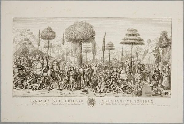 Curator: Here we have Conte Carlo Lasinio’s print entitled "The Fall of Jericho: The Giant Goliath," held here at the Harvard Art Museums. Editor: It’s quite striking, isn’t it? The detailed etching work creates a compelling, almost dreamlike quality, despite the violent scenes depicted. Curator: Indeed. Look at the labor involved in creating such fine lines. The artist clearly intended to contrast the fall of Jericho with Goliath's defeat. See how the labor of the people echoes the violence? Editor: Yes, and consider Goliath here – a fallen hero, contrasted against the symbolic meaning of Jericho’s collapse. It is a fascinating commentary on power and its fragility. Curator: I agree. The printmaking technique also makes it accessible, reproducible, designed for wider consumption and engagement in its time. Editor: Absolutely. It's compelling how Lasinio uses these interwoven symbolic narratives to make a statement about faith, power, and the human condition. Curator: A striking example of both artistic craft and layered historical meaning, wouldn’t you agree? Editor: I certainly do. It leaves you pondering the artist’s intention long after you've viewed it.