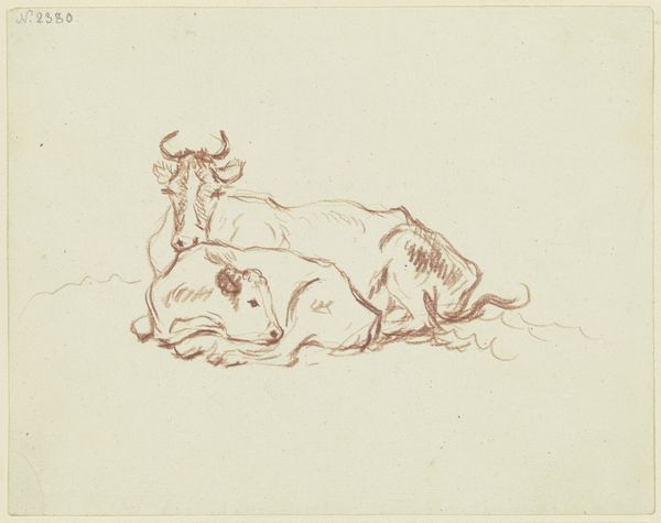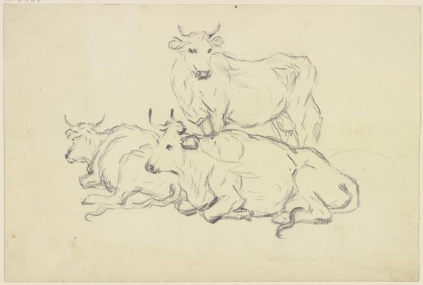 Curator: Before us we have “Liegendes und stehendes Rind” from the Städel Museum's collection. The artist behind it is Friedrich Wilhelm Hirt. It appears to be a pencil drawing of two cows. Editor: My initial reaction? It’s kind of charming, almost whimsical, like a daydream captured in graphite. The lines are so fluid, capturing a peaceful, bovine energy. Curator: Indeed. Observe how Hirt utilizes quick, almost impressionistic strokes to delineate form. Notice especially the use of hatching to suggest shadow and volume on the reclining cow, contrasting with the sparser lines defining the standing one. The composition is carefully balanced. Editor: Yes, but it feels less about technical perfection and more about… I don't know, capturing a mood? There's a sense of stillness, of contentment, that radiates from those simple lines. The standing cow seems to be in guard, an observant stillness. Curator: Formally speaking, one can argue that the seemingly simple arrangement reveals Hirt's mastery of academic art conventions while adhering to the tenants of realism. The focus on light, texture and detail of the animal figures is evident. Editor: I agree with the use of light here. See, for me, it speaks more to the universal. Those cows could be anywhere, any time. There’s something timeless about that scene – the gentle slope of the back, the peaceful stance, I think. Curator: While it is true that the theme is not especially evocative, it serves as a means for the artist to engage with realism using keen observation. Perhaps it represents a nostalgic view of nature. Editor: Maybe, but I choose to believe the appeal lies in something simpler: an artist's quiet joy in observing the world around them and feeling enough to translate it with some quick hand motions, a sketch for his eyes only, that by pure luck we get to also appreciate. Curator: A fitting sentiment. This drawing is both a skillful study and perhaps more affectively, a reminder of the simple beauty around us if only we pause to look. Editor: Right, a tiny window into someone else's quiet moment, which turns out isn’t so different from our own, if we're being honest.