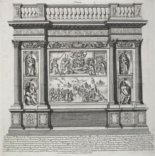 Curator: Before us is Nicolas Cochin's "West View," an engraving, now housed at the Harvard Art Museums. Editor: It feels meticulously rendered, almost architectural in its precision. The textures seem so carefully considered. Curator: Cochin, born in 1610, was working within a strong tradition of printmaking that served the purposes of documentation and dissemination of design. These prints were often commissioned, serving as models for other artworks, or as records of important monuments. Editor: The labor invested in creating this print, the skill required to manipulate the materials and achieve such detail—it's a testament to the artisan's dedication, wouldn’t you agree? The tooling marks are almost invisible. Curator: Absolutely. These prints played a key role in shaping visual culture and architectural trends across Europe. This engraving makes the inaccessible, accessible. Editor: It raises questions about what constitutes "original" versus "copy," challenging notions of artistic hierarchy. Food for thought indeed. Curator: It certainly does. Let's consider how such images played a role in shaping taste and influencing artistic production. Editor: Indeed, it offers a fascinating glimpse into the material culture of its time, reminding us of the value of skilled workmanship.