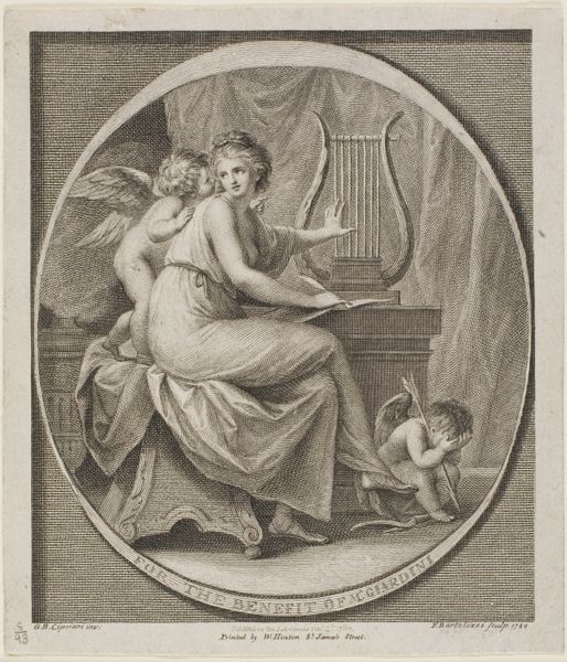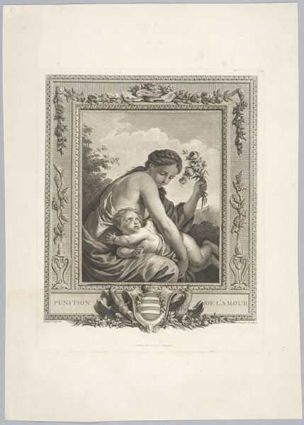 Editor: Here we have Jacques Bouillard's "Education of Cupid," an engraving. It's quite a tender scene, with Venus seemingly blindfolding Cupid. What strikes you about this piece? Curator: The act of blindfolding Cupid is particularly loaded. Consider the Enlightenment context; the image critiques the perceived irrationality of love. Editor: So, it's less about cherishing love, and more about questioning its power? Curator: Precisely. And note how the framing device – the ornate border – reinforces the artifice. It's staged, presented for public consumption and debate. Editor: I never considered the staging of art playing such a crucial role in shaping opinions. Curator: The public sphere then, as now, depended on visual rhetoric to influence perceptions and norms. Thinking about it this way shifts the whole meaning. Editor: That's fascinating. It really highlights the power of visual art to influence societal values and understanding. Thanks.