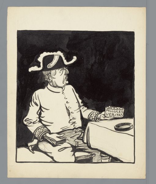 This is Albert Hahn's political cartoon, "Design for a political cartoon: the Shadow", made in 1918. The piece compels us with its stark simplicity and potent symbolism, primarily through the interplay of light and shadow. We see a figure rendered with meticulous detail in the foreground, while behind him looms a disproportionately large and ominous shadow. The contrast between the sharply defined character and the amorphous shadow is striking, creating a visual metaphor. Hahn uses shadow to convey hidden aspects or alternative interpretations, suggesting a duplicity or concealed intent. The formal composition directs our attention to the shadow, made even more prominent by its disproportionate size. The artist uses this shadow to subtly destabilize the apparent identity of the character, inviting a deeper investigation into themes of power, illusion, and the hidden nature of political figures. In essence, Hahn uses the shadow as a semiotic device, a signifier of the unseen forces shaping political reality.