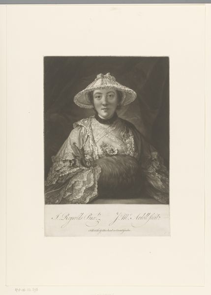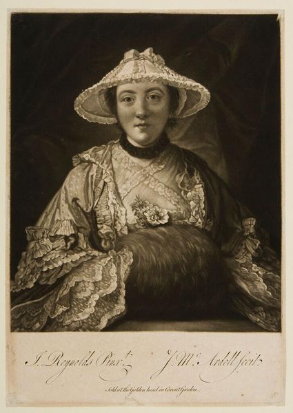 Curator: Here we have James McArdell's "Miss Anne Day, afterwards Lady Fehoulet," housed right here at the Harvard Art Museums. Editor: The lace! It's almost overwhelming, creating a frothy, textural landscape around the subject. Curator: McArdell was a master of mezzotint, note how the gradations create such a soft, almost ethereal quality. The portrait adheres to conventions, but it's the symbols of wealth that really speak. Editor: Absolutely, the fur muff, the elaborate hat. These aren’t just details, they’re potent emblems of social standing and aspiration in that era. One also feels her reserved and proper attitude. Curator: I agree. It's the tension between the surface adornment and that carefully controlled expression that makes the piece so compelling. Editor: A lovely work, it really makes one think about social roles. Curator: Indeed. It prompts questions of identity, representation, and the power of visual language.