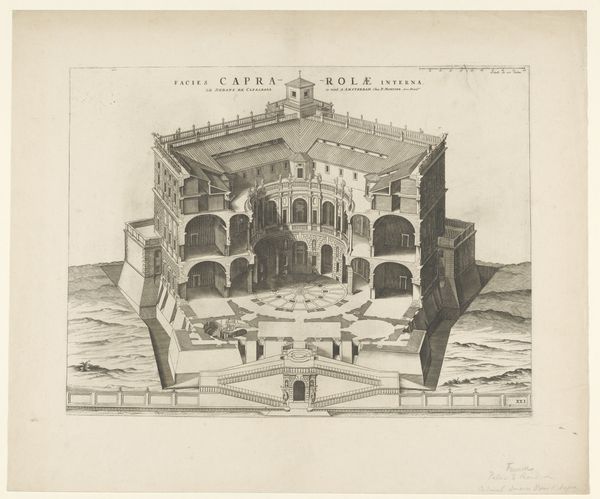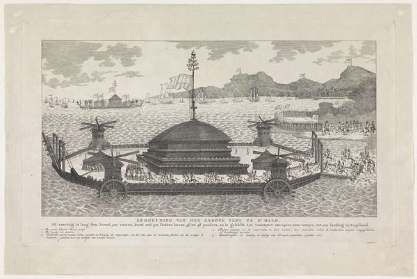 This anonymous engraving offers a bird's-eye view of Dejima, the Dutch trading post in Japan. The island's structure and composition immediately strike us. The tight arrangement of buildings, viewed from above, creates a sense of order. The engraver uses a consistent perspective to display the architectural layout and geography around the island. This method is useful for representing space, but it can also be seen as a tool of colonial power, mapping and controlling foreign territory through visual representation. The island's isolation from the mainland underscores themes of cultural exchange and restriction. The detailed depiction of the island’s structures and surrounding landscape invites us to consider how the engraver, and by extension, the Dutch, understood and represented their place in Japan. This engraving is not just a factual representation but also an interpretation of cultural encounter.