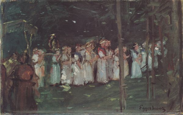 James Abbott McNeill Whistler made this painting of Cremorne Gardens using oil on canvas. The misty ambiance of the scene is created with diluted paints, thinly applied in layers. You can almost feel the cool night air. This was a deliberate choice by Whistler, who was deeply influenced by Japanese aesthetics. He sought to create atmospheric effects, evoking a mood rather than capturing a literal likeness. The visible brushstrokes, and the emphasis on tone over detail, were also a move away from traditional academic painting. Rather than disguising the labor involved, Whistler foregrounds his methods. This highlights the materiality of the paint itself, and its capacity to convey more than just a visual representation. Ultimately, by emphasizing the processes and materials of art-making, Whistler blurs the line between the fine arts and other creative practices, like design. The work challenges us to look beyond the subject matter, and to appreciate the artistry inherent in the making itself.