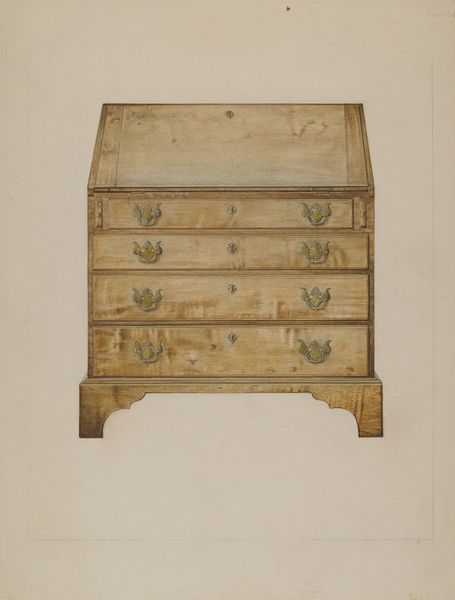 Editor: This is Ernest Busenbark's "Child's Desk," made around 1937, rendered in watercolor. It feels so...sturdy. And brown. It's a bit severe for something associated with childhood. What symbolic reading can you give it? Curator: Brown evokes the earth, certainly. And desks are thresholds to knowledge, authority, perhaps the patriarchal structure itself. Does this small desk suggest indoctrination? Editor: Indoctrination, wow. I was just thinking it's a serious little desk for serious little work. Do the drawer pulls say anything to you? Curator: The hardware is intriguing. See how they repeat? Like stylized blossoms. They soften the desk's otherwise rigid geometry, hinting at growth, potential...or perhaps femininity carefully positioned to offset all that authority? Think of the visual balance created, it’s almost an emblem of the era's domestic ideology. Editor: That’s interesting, so the artist maybe subverts that expectation? Or is he complicit with it? Curator: Precisely. By using those floral pulls he could be both criticizing and perpetuating the stereotype of women in the household. I suppose that is what is thought-provoking! How visual emblems can suggest many things. Editor: I didn't see the femininity at all. Now that you point it out, it's inescapable. I’ll have to rethink my approach. Thank you for bringing that to my attention! Curator: My pleasure! It is in these subtle contrasts and re-readings where art continues to live.