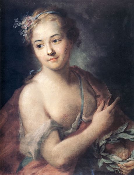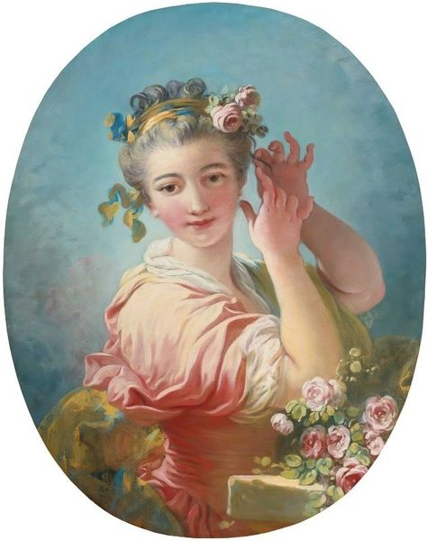 Editor: Here we have Francois Boucher's "Young Woman with a Bouquet of Roses" from 1760, created with oil paint. I'm immediately drawn to the delicate and almost dreamlike quality of the portrait. It feels so soft and idealized. What strikes you most about it? Curator: What grabs my attention is how Boucher cleverly presents and packages femininity here. This painting exists within a very specific historical moment: the Rococo period. Think about the French court, the reign of Louis XV. Boucher was a favorite painter of Madame de Pompadour, a very influential figure who shaped tastes and artistic patronage. Does knowing that context shift your interpretation? Editor: It does, actually. Knowing he was favored by Madame de Pompadour, it feels like it's not just about capturing beauty, but also conveying status and projecting an ideal image, and that's definitely different than if it was just the individual artistic aspiration of beauty! Curator: Precisely. And how do you see that playing out visually? Look at her clothing, her pose, the roses themselves. Are these merely decorative, or might they be saying something about the sitter and her role in society? What about its display in the Musee Cognacq-Jay today? What does it mean to encounter it in a space dedicated to 18th-century art? Editor: Now that I consider its placement, the rosy aesthetic probably mirrored social ideals! Displayed within a curated collection reinforces how her portrayal connects with broader artistic and social tastes from that era, which are completely distinct from, say, Modern art. Curator: Exactly! So, in viewing this portrait, we're not just looking at a pretty picture, but also engaging with the complex interplay of art, power, and social identity in 18th-century France. Editor: That's amazing; I definitely learned a lot about not only portraiture but art as a marker of cultural values! Thanks so much for shedding a light on it!