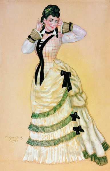 Editor: So this watercolor and oil painting from 1920 is "Katerina. Costume Design for Nikolai Ostrovsky's 'The Thunderstorm'" by Boris Kustodiev. The woman's expression feels reserved, and her elaborate costume has a life of its own. What do you see in this piece? Curator: What strikes me is how Kustodiev uses the costume design not just to illustrate a character, but to embed a complex commentary about the female experience within early 20th century Russia. Think about the social expectations placed on women, especially within theatrical roles that often mirrored or challenged those expectations. The “Thunderstorm” itself deals with themes of oppression and defiance. Editor: So the costume is more than just clothing? Curator: Exactly. The vibrant, almost overwhelming detail of her garments juxtaposes with her seemingly subdued expression. Is this a representation of internal struggle, of a character constrained by societal norms despite the potential for rebellion hinted at by the play? Editor: I see what you mean. The blue patterns on her skirt, and the dark shawl with those bursts of bright flowers…it’s all very detailed but maybe signals confinement. Does the medium of watercolor contribute? Curator: Precisely! Watercolor can evoke fragility, impermanence. Considering the political and social upheavals occurring in Russia at the time, Kustodiev might be subtly reflecting on the precarious position of women, caught between tradition and revolution. This artwork prompts questions about agency and the performative aspects of identity within specific socio-political landscapes. Editor: I didn’t think about it that way at all. The historical context adds a whole other layer to the artwork! Thanks for opening my eyes to the possibilities. Curator: My pleasure. It's through this dialogue that we unlock the deeper, more meaningful narratives embedded within art.