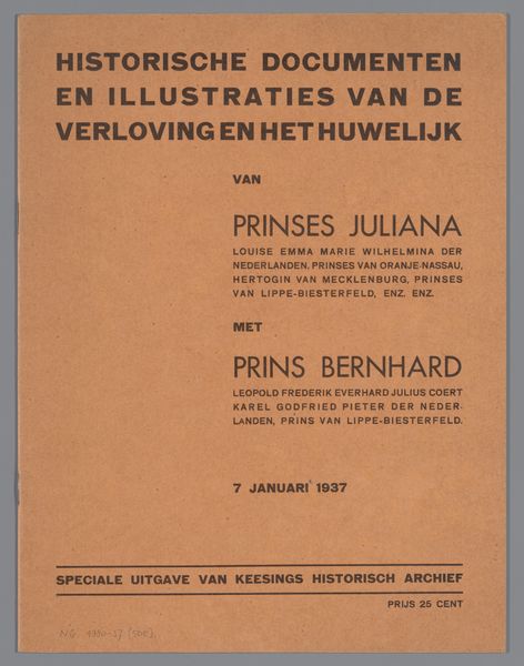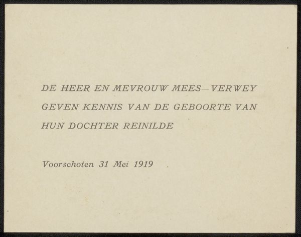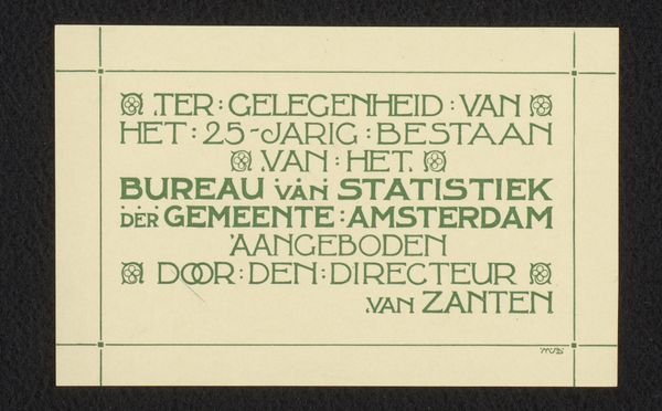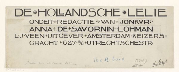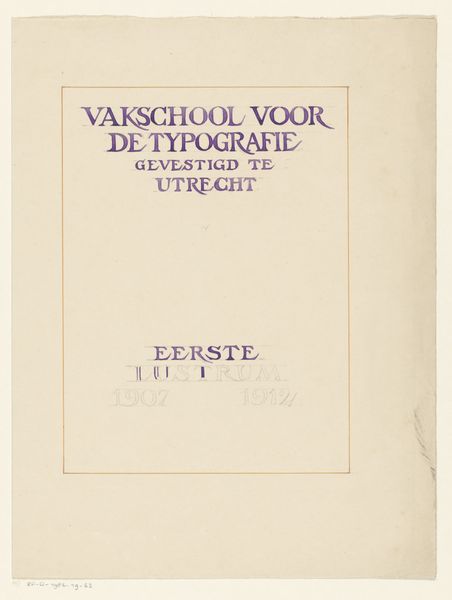 Editor: So, this is “Ontwerp voor het lustrumboek van de Vakschool voor de typografie te Utrecht,” designed in 1912 by Reinier Willem Petrus de Vries. It looks like a poster or print, perhaps for a school’s anniversary book. It's simple, almost austere, but with that really elegant typeface. What leaps out at you? Curator: It whispers, doesn't it? A delicate balance. You've got the very ordered framework—that classic Art Nouveau striving for geometric precision—but then those wonderful swirling letterforms almost break free. Doesn't it make you wonder what a 'Vakschool voor de Typografie' actually *did* back then? Like, were they as obsessed with serifs as we are now? I bet they were! Editor: Totally! What’s the deal with the frame around the text? Is that just a common design element? Curator: The frame, for me, it’s all about containment. The exuberance of the type wants to expand, to breathe, but it's held. It gives a sense of formality – this *is* for a school, after all – but that tension… it's delicious. Do you feel it pointing you to a particular era? That tension between modernity and tradition… Editor: Definitely feels turn-of-the-century-ish. What is your impression? Curator: This piece, in a quiet way, reflects the energy of the time. Before everything changed. The first World War changed all that. I mean, this is technically 'just' typography, but it is brimming with personality. Imagine that school, full of these designers. All those debates! Editor: It makes me appreciate the artistry in something we take for granted now, the fonts we see everywhere. Curator: Exactly! That is why it’s so cool that pieces like this can make us see type with fresh eyes, now doesn’t it?