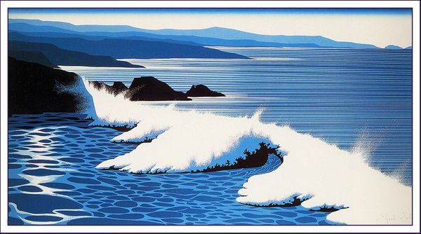 Here we see Eyvind Earle's artwork. In this image, the interplay of shapes and colors creates a visually stunning seascape. Earle uses strong, clean lines to depict the massive white wave as it crashes against a dark, rocky shore. The stark contrast between the bright wave and the dark rocks and deep blue sea evokes a sense of dramatic tension. The composition is carefully structured with flat planes of color and simplified forms, a nod to modernist abstraction. By reducing natural forms to their essential shapes, Earle invites us to consider the underlying structure of the landscape. The repetitive, rhythmic patterns in the water and the wave suggest a sense of perpetual motion, while the static mountains in the background provide a sense of enduring stability. This juxtaposition of movement and stillness reflects a larger philosophical inquiry into the nature of change and permanence. Ultimately, Earle's formal arrangement is not merely decorative but deeply communicative.