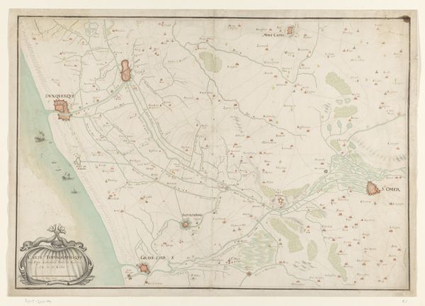 Adriaan Jan Bogaerts created this "Kaart van een deel van Zuid-Holland en Zeeland" as an exercise in cartographic representation, where he used ink and watercolor to chart a complex region. The composition is dominated by a network of linear delineations, illustrating land divisions and waterways that evoke a sense of intricate organization and control over space. Looking closely, one might ask how the map functions beyond mere representation. The use of distinct colors to differentiate land and sea isn't simply descriptive; it's a structuring principle that presents the territory as an ordered, manageable entity. Each segment, each line, operates as a sign, inviting interpretation within a structured system of spatial and political understanding. The strategic placement of waterways and territorial markers could even challenge our perception of natural and artificial boundaries, questioning where one begins and the other ends. In doing so, the map provokes questions about the construction of space and the power dynamics inherent in claiming and dividing territories.