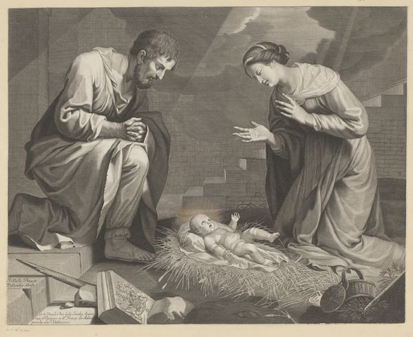 Jean Grandjean created "The Angel and the Three Marys at the Empty Tomb of Christ," a work of detailed ink drawing. The composition immediately draws the eye to the radiant angel, dramatically positioned to the left of the frame. The drawing emphasizes a stark contrast between light and shadow. This creates a dramatic, emotionally charged atmosphere. Note how the angel isn't just a figure of divine presence but also a masterclass in classical form. Grandjean's precise lines define the muscles and drapery, lending a tangible weight to spiritual concepts. The empty tomb—the center around which the figures gather—serves not merely as a setting, but a void that challenges fixed meanings, inviting viewers to question the very foundations of mortality and faith. The image’s formal elements extend beyond mere representation, functioning as a visual rhetoric that still resonates today. It captures a pivotal moment open to continuous interpretation and cultural dialogue.