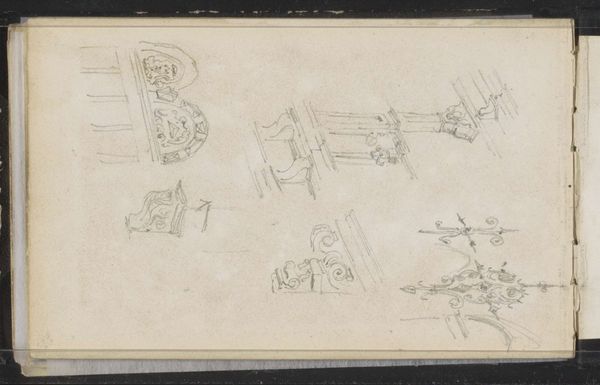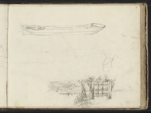 Curator: Alright, let's delve into this intriguing piece, "Houten hekken en palen," or "Wooden Fences and Posts," rendered in pencil and paper by Johannes Tavenraat between 1843 and 1857. You know, found right here at the Rijksmuseum. Editor: Oh, my. It has the feel of something remembered. A quick impression caught in charcoal almost. Do you suppose they still exist, somewhere in a forgotten field? I’m drawn to the honesty of it. It reminds me of simpler days, fences sketched as solid but delicate as thought itself. Curator: Indeed. The realism evident in the linework is quite fascinating. Note the rudimentary structural forms. These aren't idealized fences; instead Tavenraat captured a practical, almost functional aesthetic. We see elements reduced to their geometric essence. Editor: Absolutely, I find a distinct narrative thread in its very plainness. There’s an open-ended question lingering in the lines, asking us to appreciate the inherent beauty in something quite commonplace. The scale suggests something unassuming, approachable, but the thought behind each of them feels intentional. Curator: Yes, and if you examine it through the lens of semiotics, the fences function as more than just physical barriers. They also communicate ideas of enclosure, property, and, perhaps, the taming of nature in the landscape. It certainly embodies some key values for land during that era. Editor: You've given me even more reason to love its rough charm! But really, doesn’t it ignite curiosity, asking, "Who built these? What stories do they keep silent vigil over?" It makes me dream about wandering on misty mornings. Curator: It is remarkable how an understated composition manages to invoke such vivid emotional responses. Editor: Agreed. Thanks, that clarified how much story an old fence can suggest.