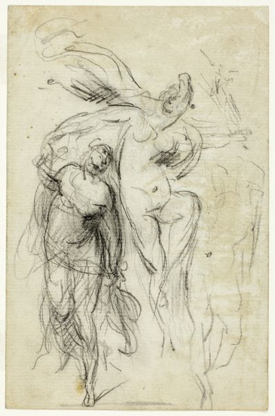 Federico Barocci made this drawing, "The Descent from the Cross," using chalk and graphite on blue paper. The texture of the paper itself is quite visible; it has a tactile quality that contrasts with the ethereal scene Barocci is depicting. The blue creates an atmospheric depth, against which the figures are sketched, giving them an almost ghostly presence. You can see the artist's hand at work in the layering of chalk and graphite, building form and volume with loose, expressive strokes. This emphasis on the material and the process invites us to consider how the artist’s labor, and his skill in manipulating these materials, shapes our experience of the sacred. The drawing has a raw, unfinished quality which reminds us of the hours of work involved in creating an artwork. This contrasts with the polished finesse we often associate with the High Renaissance. By drawing our attention to the materials and methods, Barocci bridges the gap between the artist's studio and the divine narrative.