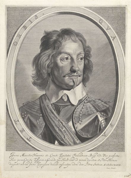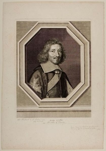 Curator: What strikes me about this portrait, Robert Nanteuil's "Michel Le Tellier, Le Chancelier," is the sense of controlled power emanating from the figure. Editor: Indeed. The oval frame and the meticulously rendered coat-of-arms add to that air of formality, don't they? Le Tellier, as Chancellor, held tremendous influence during Louis XIV's reign. Nanteuil, through the symbolic weight of these visual elements, really amplifies that impression. Curator: Absolutely. The gaze is direct, but not confrontational. It suggests authority rooted in something deeper than mere political position. There's a psychological complexity here; the symbols hint at a legacy, a lineage, perhaps even a burden of responsibility. Editor: It’s fascinating how Nanteuil, working within the conventions of state portraiture, manages to hint at the man beneath the office. The print becomes not just a representation but a statement about power and its visual construction. Curator: It leaves me contemplating the enduring power of imagery to shape not just perception, but also historical memory. Editor: And for me, it underscores the crucial role portraiture plays in crafting a public image, influencing how figures like Le Tellier are remembered.