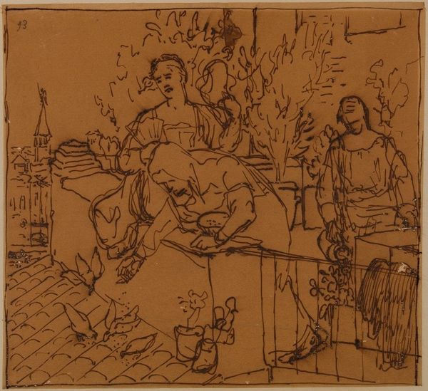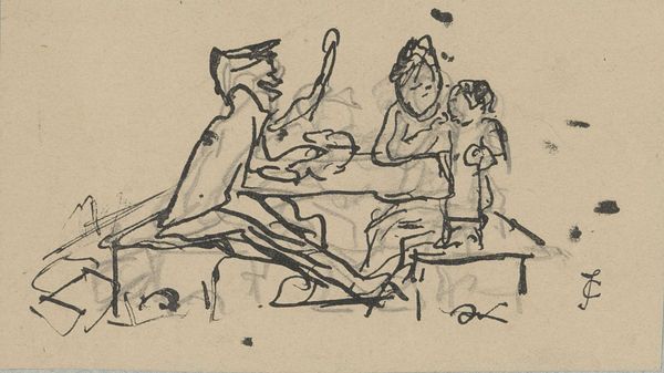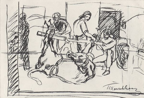 Curator: So, here we have Kuzma Petrov-Vodkin's 1932 drawing, "In the Smithy." It’s rendered in pencil and ink. What are your first impressions? Editor: Wow, immediately I’m getting a sense of heat and grit. The whole thing's so raw, like a quickly jotted-down impression. It feels…industrial, but human. The guys seem both exhausted and proud. You know? Curator: Absolutely. This drawing speaks to the heart of the industrialization drive in the Soviet era. Petrov-Vodkin was deeply invested in depicting the dignity of labor. How do you see that coming across? Editor: It's in the stance of the figures, definitely. Look at the man standing front and center – shoulders squared, a sort of quiet watchfulness in his eyes. Not romanticized, exactly, but strong, determined. And the simplicity of the lines... there is no pretense. It says 'we're building something here.' What's fascinating to me is how the light and shadow emphasizes how strenuous it must be. Curator: The use of line is interesting, especially when thinking of Social Realism's aims. It wasn’t simply about documenting work, but imbuing it with symbolic meaning—a commitment to progress. We must, of course, acknowledge its role in bolstering a specific ideological narrative during that period, as it does idealize labour. Editor: See, that's where my head was going. There’s something heroic in their down-to-earthness; in fact, you could also perceive their labor as both strong and weary, without masking reality. There's a beauty there, not of the polished sort, but one earned. And that simple style lets you connect, doesn’t it? Curator: Indeed. The composition makes these workers archetypes. These aren't specific people so much as representatives. The viewer is drawn into contemplating themes of labor, identity, and collective purpose within a quickly changing nation. Editor: Exactly. This drawing sticks with you; it's a simple yet complex portrayal of humans at work, at life, if you will, during such tumultuous times. A look that goes straight into your bones. Curator: Well, I must say, that's an appropriately visceral reaction to end with. Thanks! Editor: My pleasure! Anytime you'd like me to add emotion to the analytical.