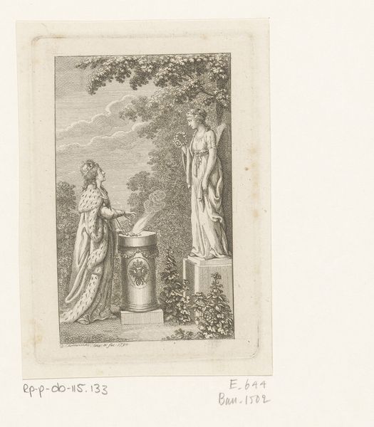 Daniel Nikolaus Chodowiecki created this small etching, “Goed moederschap,” which translates to "Good Motherhood," sometime in the late 18th century. Chodowiecki lived through the Enlightenment, and was deeply invested in the moral and social issues of his time, particularly those concerning the family. Here, he presents us with an image of bourgeois domesticity: a mother lovingly cradles her child as she walks in a garden with the child’s father. Consider how gender roles are carefully delineated in this image. The mother is soft and nurturing, while the father stands behind them, a symbol of protection and authority. The etching seems to affirm the era’s emphasis on the importance of women’s roles as caregivers. Yet there is an emotional resonance here too; an evocation of the tenderness and responsibility inherent in raising a child. Ultimately, “Good Motherhood” is a window into the past, reflecting how societal expectations around gender and family were both idealized and internalized during this period.