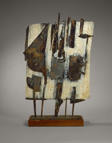 Barbara Tyson-Mosley made this, Infant Garment, using mixed media. The materials are what grab me first: the rough textures, the muted colors. It's like she's not just depicting something, but building it, layering it into being. Looking closely, I see how she's used these strips of fabric, some stained with what looks like rust or maybe an earthy dye. They’re draped and layered, creating depth. The textures contrast with the smooth, treated background, which feels both aged and deliberate. Notice the orange here and there. It's like a little spark, catching your eye, preventing the work from receding. I love the way she leaves the edges raw, letting the material speak for itself, like a conversation between decay and design. The work reminds me a little of some of the assemblage work that was happening in the mid-century, but with a softer, more personal touch. It's a piece that stays with you, inviting multiple readings, never settling on one fixed meaning.