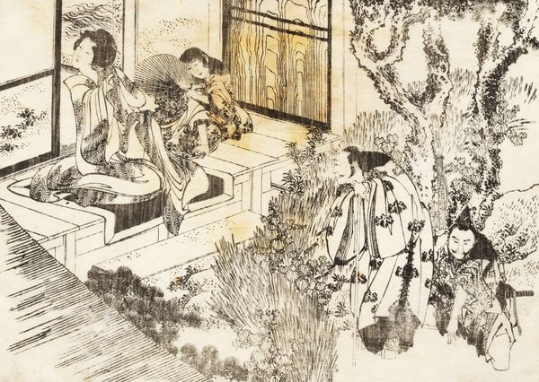 Editor: We’re looking at "Scene from the Chushihgura (Vendetta of the 47 Loyal Retainers)," a woodblock print by Torii Kiyomine, likely made between 1810 and 1830. It's currently at the Met. The whole scene feels very dreamlike. It's hard to believe that it represents such a dramatic subject with these very soft lines and the women are surrounded by lovely gardens, but how are we meant to look at it? Curator: Consider the implications of its mass production. The *ukiyo-e* prints like these, meant for a burgeoning merchant class, brought narratives of samurai loyalty, of *bushido*, to a broader audience. What impact did this have? Did it democratize a warrior ethos, or did it serve to pacify a potentially restive population by romanticizing the past? Editor: So the medium itself shaped the message? Because it's a print made for a large market. Curator: Exactly! It wasn't commissioned by the elite for the elite. And think about the labour involved in producing a woodblock print - the artist, the carver, the printer, all contributing to this image of idealized loyalty. The lines are very soft but are precise because the woodblocks are a subtractive process - this also points to high skill in crafting an elaborate print. How might this production process inform our understanding of the depicted story? Editor: That’s fascinating. I was focused on the figures and composition. Now I’m considering the whole social context surrounding how the artwork was manufactured and spread. So, by examining the materials and its creation, it's not about individual genius but a product of collective effort which helps understand the cultural effect. Curator: Precisely! It allows us to appreciate how the narrative was circulated and consumed in 19th-century Japan. Editor: I see it now! It's less about the artistic interpretation of one person, and more about what material culture tells us about the era it was created in.