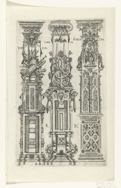 Curator: Instantly, I see intricate lace…a visual riddle etched in black and white! Editor: This is an engraving from 1622, titled "Twee balusters of termen en pinakel," which translates to "Two balusters or terms and pinnacle." It appears to be the work of an anonymous artist during the Baroque period. The piece meticulously details architectural elements: balusters, those vase-like supports you often see in railings; terms, the architectural structures often featuring a human bust or figure; and a pinnacle, a pointed ornament. Curator: Right, architectural… that explains the somewhat sterile, geometric backbone holding everything together. The Baroque flourish feels almost rebellious against that rigid form. Editor: Baroque is all about elaborate ornamentation, and we see that expressed here in the curling embellishments and layered structures of each design. Balusters and terms like these were not just structural. They were deeply symbolic. A term, with its connection to a figure, often acted as a guardian, a boundary marker, even a representative of classical ideals. Curator: So, even seemingly simple lines hold this echo of a Roman past? A cultural memory, striving to resurrect classical grandeur! Editor: Absolutely. This image offered patterns and examples to the artisans who were charged with expressing this grandeur in three dimensions. In it we glimpse the fusion of classical motifs and emerging baroque dynamism through symbolic ornament. Look closely – each line builds towards the monumentality these small sketches aimed to inspire in constructed forms. Curator: That tension is what really grabs me: this tension of something solid built atop fragile, fleeting impressions. It is a potent image, a conversation across centuries. Editor: And a reminder of how the seen, and even the seemingly purely decorative, carried powerful cultural and intellectual weight.