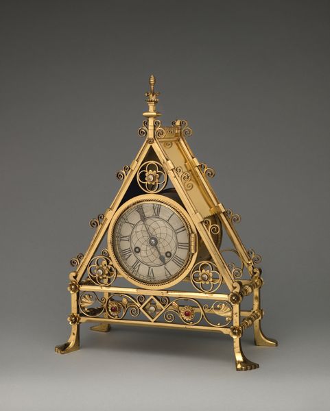 This gold nécessaire was created around 1720 by John Best. Notice how the ornate filigree work gives a sense of depth and complexity to the structure. The gold is configured in a hexagonal shape, offering a visually interesting object that toys with light and shadow. The piece invites a dialogue between form and function. It serves not merely as a container, but as a statement about the era's approach to craftsmanship, class, and luxury. The intricate latticework, juxtaposed against the dark interior, creates a play of positive and negative space, challenging our perception of what constitutes solidity and void. Consider how the addition of the clock transforms the object into a symbolic marker of time. It reminds us of the value placed on temporal awareness in the aristocratic lifestyle. The craftsmanship and design encourage us to ponder the broader narratives about artistry and the cultural values embedded within functional objects.