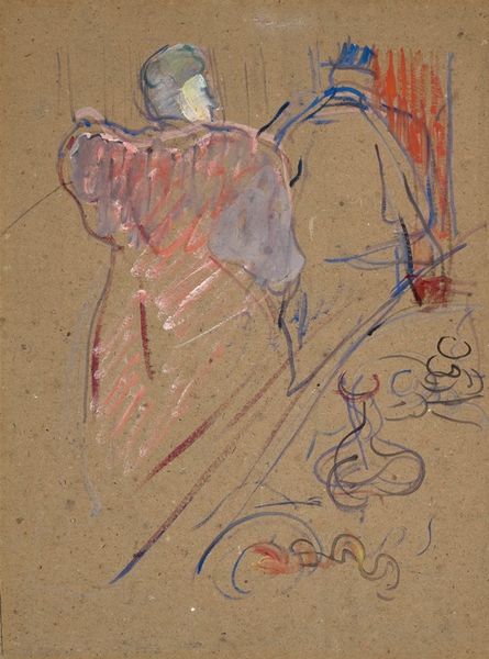 Editor: This is Paul Gauguin's "Arearea no Varua Ino (Words of the Devil)" from 1894. It appears to be a watercolor or oil painting, maybe even a print. I'm really struck by the flat planes of color and how the figures seem to exist almost as part of the landscape itself. How do you interpret this work, especially regarding Gauguin’s materials and methods? Curator: From a materialist perspective, this piece reveals much about Gauguin's relationship with his subject matter. The very title "Words of the Devil" directs us to question the authenticity of Gauguin’s representations of Tahitian life. He wasn't just depicting what he saw, but constructing a vision fueled by his own cultural biases and the exotic fantasies consumed by the European market. Editor: So you're saying his choice of materials and techniques might be influencing how Tahiti is perceived? Curator: Precisely. The flattened perspective and use of color could be interpreted as Gauguin’s attempt to move away from Western academic painting. But even in this rejection, we see the power dynamics at play. He’s extracting visual elements from Tahitian culture and repurposing them through a Western artistic lens. How does the visible labor involved in making prints versus paintings impact your understanding? Editor: That’s fascinating! I hadn’t really considered the implications of printmaking in circulating potentially skewed images. It’s interesting how his aesthetic choices intersect with issues of cultural appropriation and the romanticization of "primitive" societies. It really opens my eyes to seeing beyond the surface beauty. Curator: Exactly. By focusing on the processes, materials, and context, we can deconstruct the complex layers of meaning embedded within even the most seemingly idyllic scenes. It's important to consider his intentions behind circulating such images to western audiences.