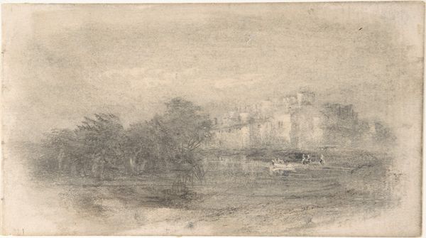Editor: This is "On the Banks of the Loing: Houses by the Water," an etching made by Alfred Sisley around 1890. There's a stillness to this print, almost like a faded memory. What do you notice about the composition that stands out to you? Curator: Observe the horizontal orientation; it stretches the composition across the plane, emphasizing the flatness of the picture and, concurrently, the implied plane of water. Sisley juxtaposes short, gestural marks in the foreground against increasingly stable, orthogonal strokes to describe the architectural space of the buildings on the bank. This tension animates the entire surface of the picture. Editor: It's fascinating how the foreground is so active, compared to the still architecture. How does that contrast impact the image? Curator: Note how the buildings, while more stable in their depiction, are also composed of layered, closely hatched marks. This recalls the atmospheric effect one sees in Turner's prints; how the massing of marks results in an image, rather than lines defining an object. Do you see how that application unifies the disparate parts of the composition? Editor: Yes, I do! So it's about balancing that contrast with a consistent mark-making throughout the image? Curator: Precisely. The buildings and the water, despite their representational differences, share a similar visual language in the etching technique. The artist compels us to consider the very structure of the picture, the artistic intervention itself. Editor: I never would have seen all of that on my own. I'm starting to appreciate the complexities within what I initially saw as a very simple, serene scene. Curator: Indeed. Considering the relationship of marks and composition, a deceptively simple etching reveals a depth of artistic intention.