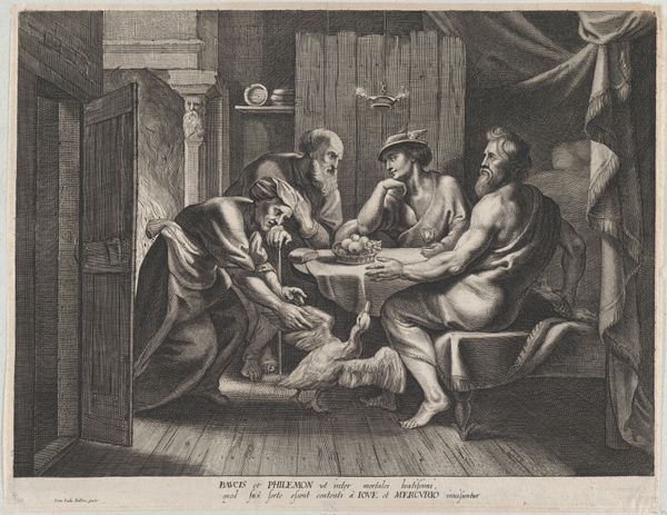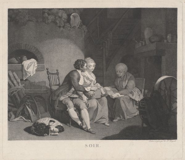 Editor: This is "Boereninterieur met bonenpellers," which translates to "Peasant Interior with Bean Shellers," an engraving from around 1760 after a painting by Teniers. The interior scene, with its dim lighting, evokes a sense of everyday labor and community. What jumps out at you in terms of historical interpretation? Curator: The most striking aspect of this print is the way it elevates a seemingly mundane activity—shelling beans—to a subject worthy of artistic representation. Genre scenes like this became popular as printmaking democratized art and allowed for wider distribution to a growing middle class. Who exactly do you imagine the audience was for an image of working people relaxing indoors together? Editor: I suppose city dwellers who are interested in rural life? Did they consume images like these just as decoration or were there some other motivations? Curator: Certainly some might have consumed this as decoration, but these images also carried significant social and political weight. Remember that the late 18th century was a period of immense social change. Representing peasants in a certain way, sometimes sentimentalizing their existence or portraying them as virtuous in their simplicity, was a way of managing anxieties about class differences and social unrest. Do you see that idyllic tone at play here, even in the subdued light? Editor: I think so. It looks idealized to me, since everything appears neat and the workers relaxed. Like the toil is gentle. Is that just me? Curator: Not at all! Consider the power dynamics inherent in who gets to depict whom, and what purpose that depiction serves. While seemingly innocent, images like this participated in shaping perceptions of different social classes and justifying existing power structures. Editor: That's something I hadn't considered fully. Thank you for clarifying the nuances. It's made me think about the politics embedded in the every-day representations. Curator: Absolutely, and by exploring those connections, we can understand art’s role in shaping our understanding of society, both past and present.