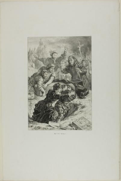 Editor: This is "Children these days are a bad lot!" created in 1827 by Auguste Raffet. It's a lithograph, a kind of print, on paper, and it strikes me as pretty satirical. What do you see in this piece? Art Historian: Well, looking at this from a historical perspective, what immediately grabs me is the social commentary. Raffet, in 1827, is capturing a specific sentiment – a classic complaint across generations. Do you think this concern with generational decline might reflect specific anxieties of the Restoration era in France? Editor: Possibly! I mean, the French Revolution was still pretty recent, right? So maybe the older generation was worried about the values being passed down. The children here are definitely rowdy – they are wielding swords, one’s holding an umbrella open... It's pretty chaotic. Art Historian: Exactly. Consider how printmaking, especially lithography, allowed for the widespread distribution of images like these. It becomes a tool for shaping public opinion, reinforcing or challenging social norms. Notice the figure in the background - an authoritative figure carved into the architecture looking on. Editor: I see that figure! It contrasts so strongly with the disarray in the foreground. And now that I think about it, maybe Raffet isn't just reflecting social anxieties, but perhaps exaggerating them for comic effect. Was Raffet trying to promote change, or reinforce traditional ideas of childhood behaviour? Art Historian: That's a crucial question. Raffet is tapping into anxieties of the era. The availability of print like this created a wide distribution of his view. This could reinforce it in ways only he would truly know. It's likely more nuanced. Artists often negotiate complex relationships with the power structures of their time. What's your take away here? Editor: I've learned to think about how the artist's choices – the medium, the subject, the style – connect to broader social and political conversations happening at that time. This artwork isn’t just a snapshot, but a real opinion distributed among a specific public. Thanks! Art Historian: It’s fascinating how a single print can open up a window onto an entire era. Seeing art as cultural participation changes everything.