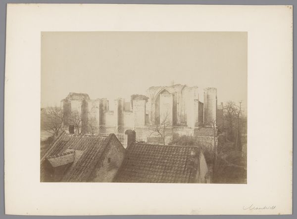 Editor: This is Roberto Rive's "Ruïne van de tempel van Hera Lacinia te Agrigento", taken sometime between 1860 and 1889. It's a gelatin-silver print, and honestly, the image of these crumbling ruins evokes such a strong feeling of loss. How do you interpret this work, especially considering its historical context? Curator: This photograph captures more than just the ruins of a temple; it's a document reflecting the 19th-century European fascination with antiquity and its role in shaping national identities. The ruins themselves were powerful symbols, and their visual representation was carefully constructed. What do you notice about the photographer's choice of perspective? Editor: I see the temple ruins positioned prominently on a small rise of land. They dominate the composition, but are framed by empty space; this reminds us of what used to be there, maybe. The land, with rough terrain and patchy foliage, creates a rather isolated feel, separating the structure from its surroundings. It is not just a ruin, it is abandoned and apart. Curator: Exactly. The perspective emphasizes the temple's grandeur but also its isolation and decay. Consider the role that photography played in popularizing and even romanticizing classical ruins during this period. These images were often circulated as tourist souvenirs, shaping perceptions of ancient civilizations. How might this impact our understanding of the image today? Editor: It shifts my perspective. It becomes a commodity; both an artifact and a symbol, almost exploited and devoid of its cultural significance, simply becoming something beautiful to possess, removed from the deeper historical narrative and presented solely for aesthetic consumption. Curator: Precisely. We have to recognize the complex relationship between historical preservation, tourism, and the politics of imagery in the 19th century. These photographs weren't just neutral documents, they played an active role in constructing a certain vision of the past. Editor: That's fascinating! I'll definitely look at these older photographs with a much more critical eye going forward. Thank you for shedding some light on this historical background.