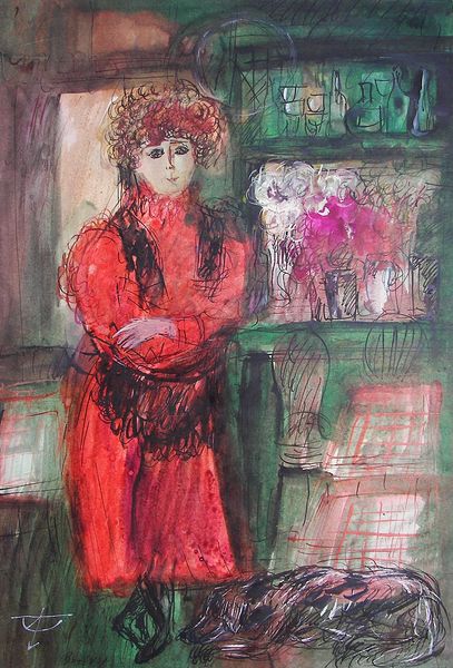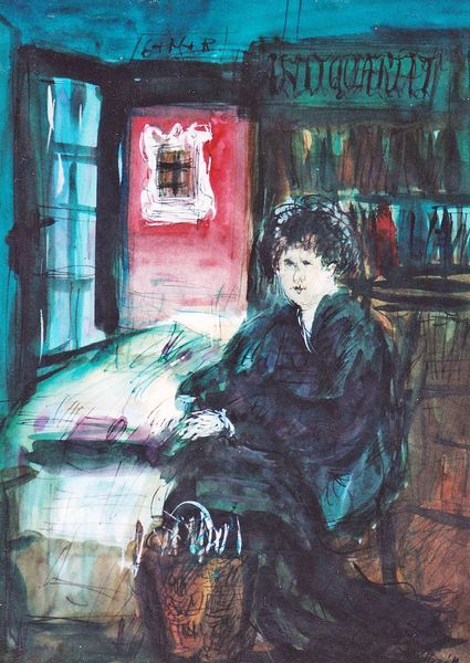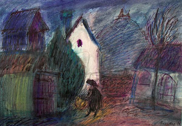Curator: Looking at Maria Bozoky's "On the Corner at Kožená, Prague," painted in 1992, what strikes you immediately? Editor: There's an immediate melancholy, I think, from the subdued palette. And this figure—rather awkwardly placed in the composition it seems, with disproportionate elements—emanates an air of solemn resignation, doesn’t it? Curator: Interesting. For me, the real draw lies in understanding Bozoky’s working process. The visibly layered washes, perhaps watercolour or very thinned oils, hint at a delicate dance between intention and chance. We know very little about her, yet these visible construction choices suggest a tangible, physical engagement with place. Editor: Yes, but what do the brushstrokes themselves communicate? Note how the buildings are suggested with quick, almost ephemeral lines, juxtaposed against the relative density of color in the figure. It emphasizes their isolation and inner state doesn’t it? Curator: I'd argue it’s less about a fixed 'inner state' and more about exploring how public and private space, especially the corner of a street like Kožená in Prague, might have existed after the political change during this time period in 1992. What social realities do those lines imply when one looks closer? This, I think, speaks more forcefully about both artistic struggle and lived existence than notions of simple interiority. The location itself seems critical in understanding the painting’s larger purpose, it being such a common and unassuming street in Prague. Editor: You raise a compelling point about location and production, and its social and cultural implications. Still, I’m fixated on this use of watercolor techniques and the quick gestures—there is an expressiveness there beyond the simple documentation of an interaction with locality, the construction, material interaction if you will, still remains one where expressiveness is made dominant. It hints to an artistic self reflection regardless. Curator: Indeed. Each brushstroke embodies a whole host of conditions – political conditions that shaped identity for those living on that very corner. Thank you for highlighting those. Editor: And thank you, for drawing us into those corners of Prague, making us stop and notice what resides within and just beyond those lines of Maria Bozoky's remarkable work.