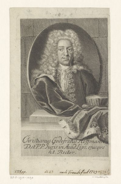 This print, by Johann Friedrich Rosbach, presents a formal portrait of Christian Wolff. Notice how the composition is structured around contrasting textures. The soft, almost cloud-like wig dramatically offsets the sharp, clean lines of the rectangular frame surrounding the portrait. Rosbach masterfully manipulates light and shadow to create depth. Observe the subtle gradations that sculpt Wolff's face, giving him a palpable presence. The dark background makes the intricate details of Wolff's robe and wig stand out. This use of chiaroscuro heightens the visual drama. This portrait exemplifies Enlightenment ideals by employing a rational and balanced design, and by capturing the essence of its learned subject. It functions not only as a likeness but also as an emblem of intellectual authority. It stands as a testament to the power of formal elements in conveying complex cultural meanings.
