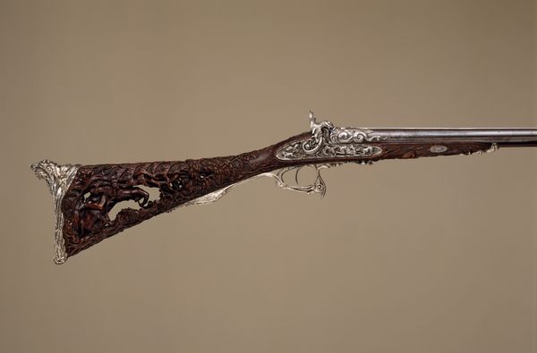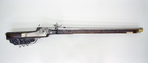 Curator: Here we have a wheel lock rifle dating back to about 1630. It’s currently held in the collection of the Minneapolis Institute of Art. Editor: My first thought? It's absolutely gorgeous. The detail work is astonishing. Such intricate patterns across what is essentially a weapon. Curator: The sheer amount of time that went into its production is amazing. When you consider the metalworking and engraving needed to craft this object it speaks volumes about available labor. Editor: Absolutely, but who exactly was it available to? Wealth and power are intrinsically woven into the piece's DNA, I imagine. Someone wasn't using this beauty for daily hunting but more as a statement piece? Curator: Precisely. Wheel lock rifles were the cutting edge in firearm technology during the 17th century, much more expensive than matchlocks. Owning one became an elite symbol. The materials, skills, and artistry highlight social stratification during that period. Editor: Right, like visible consumption long before Veblen coined the term. And it makes me think about who the artist might have been. A craftsperson probably invisible in the history books creating an instrument ultimately for domination. What are we meant to reconcile here? Curator: Indeed, labor history compels us to see beyond mere aesthetics, unveiling production means and the social status embedded in artistic labor. While admiring the ornate design, we must remember its origin within a specific system of patronage. Editor: Perhaps what's most unsettling about this ornate piece is recognizing the role it represents, transforming what may have begun as craft into a brutal device enforcing asymmetric power relations during Europe’s expansionist era. The visual beauty only obscures this reality. Curator: Understanding these dynamics gives me a richer perspective, a layered sense of awe, and also awareness. Editor: Ultimately, pieces like this push us to wrestle with how objects connect artistic skill with historical violence, prompting us to view both beauty and terror within our collective past.