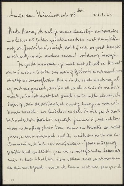 This is a letter written to Anna Dorothea Dirks, penned in Amsterdam on January 30th, 1924. What strikes me first is the intimate dance between the script and the page. See how the dark ink almost seems to burrow into the fibers, each word a little nest of intention. The lines of the paper act as a guide, but the handwriting has its own rhythm, a kind of controlled chaos. There’s a tenderness in the looping letters, a sense of care. It reminds me of Cy Twombly's scribbled poems—not so much about legibility as about the pure energy of mark-making. Each stroke feels like a breath, a thought, a feeling given form. It's about touch. It makes me think of Agnes Martin’s quiet grids, where the slightest imperfection speaks volumes. Art is, after all, a conversation across time.
