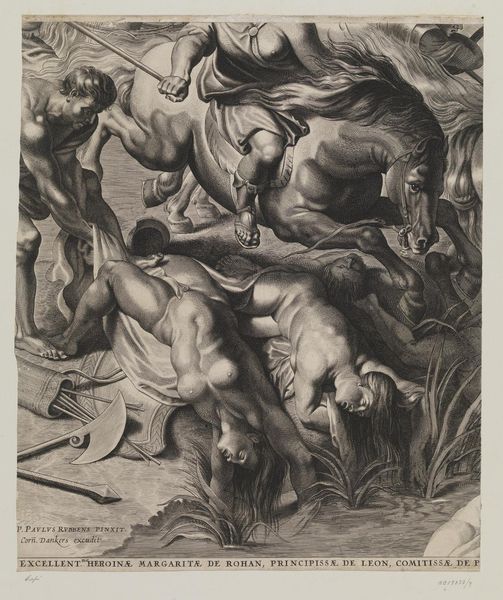 Editor: This is Michel Dorigny's "Venus and Adonis," a small print at the Harvard Art Museums. The figures are dynamic but a little chaotic. What compositional choices stand out to you? Curator: Note how the ovoid form tightly contains the figures, pressing them against its boundaries. The lines create a dense, almost claustrophobic space. Dorigny emphasizes tonal contrasts, particularly in the drapery. This juxtaposition of light and shadow enlivens the surface. Editor: So, you see the formal elements as contributing to a sense of tension? Curator: Precisely. The curvature and compression certainly heighten the drama. I find it an accomplished study in form and technique. Editor: I see that now. Thanks for pointing out the formal structure; it does add to the storytelling.