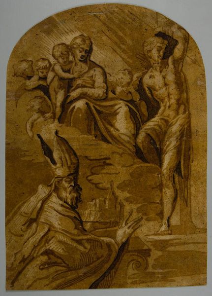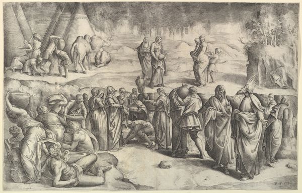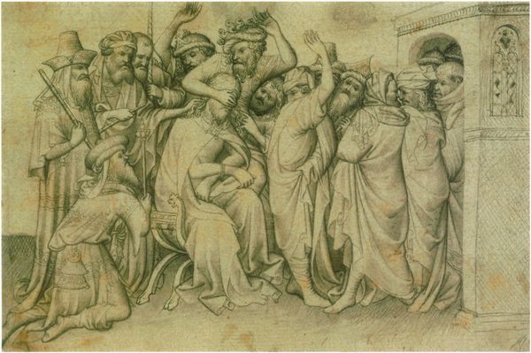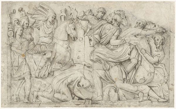Editor: This drawing, "Noah, his Family and the Animals Leaving the Ark," is by an anonymous artist. It depicts the biblical scene with delicate lines in brown ink. It feels like a moment of hope and renewal, but what do you see in this work, especially considering its historical context? Curator: I see a powerful intersection of faith, family, and the environment. The depiction of Noah’s family highlights the importance of lineage and continuation, resonating with societal structures that often prioritize patriarchal narratives. But what about the animals? Editor: They seem to represent a chance to rebuild what was lost. Curator: Precisely, it prompts questions about our own responsibilities in the face of environmental catastrophe. Who gets saved, and who gets left behind in our modern "arks?" What do we owe future generations in terms of the planet we leave behind? Editor: It's incredible how a seemingly simple drawing can spark such complex thoughts. Curator: Art is a mirror reflecting our values and challenging our beliefs, and that is invaluable to how we interact with the world around us.