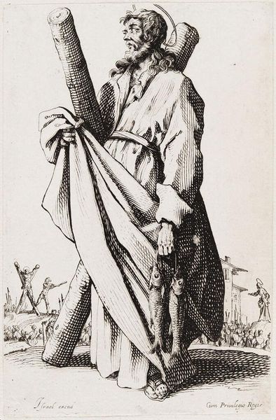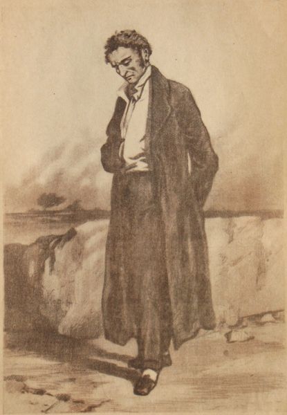Editor: Here we have Andrei Ryabushkin’s “Alyosha Popovich. Illustration for the book “Russian epic heroes,” created around 1895 using pencil. The details are striking and it has a romantic aura. What strikes me is the way Ryabushkin blends a very stoic portrait with such domestic background details. What do you make of this? Curator: It is an excellent point. Ryabushkin was consciously engaging with a romanticized, almost folkloric view of Russian history, wasn’t he? It is made more powerful, since, as an illustrator for books, he knew well what settings resonate with an audience craving a strong sense of national identity, doesn't he? Editor: That makes sense. I'm getting a sense of mythmaking. Curator: Exactly! The choice of subject matter and technique also place the image squarely within a visual culture searching for uniquely Russian motifs, setting him apart from more academic painters favored by the Tsarist court. How might that resonate with the rising nationalistic feelings of the time? Editor: So you're saying this isn’t just about portraying a hero; it is about defining what it *means* to be Russian? Curator: Precisely! By drawing from the Byliny, the Russian oral epics, and visualizing them, Ryabushkin helps construct a powerful and very public narrative around national character. Editor: That makes the backdrop more than just scenery – the horses, the tents… It reinforces that whole cultural identity. This puts the artist himself into a very specific political and social role, doesn’t it? Curator: He becomes a cultural ambassador and consolidates popular belief around the notion of “Russianess.” Do you see a relationship between that kind of historic imagery, national museums, and cultural agendas? Editor: Absolutely, thinking about it now. I realize the museum also performs a similar role! I’ll certainly view historical illustrations differently from now on! Curator: Indeed. It’s all interlinked. Thanks for noticing that.