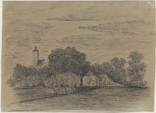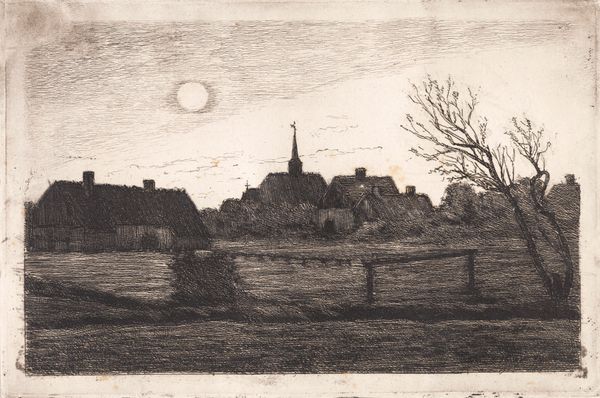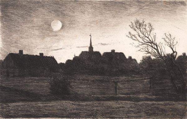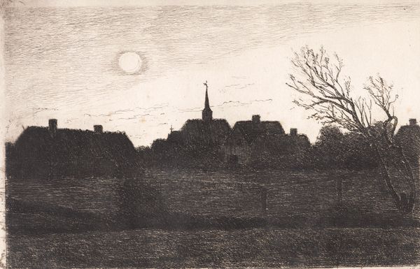 Carl Locher created this etching, Hornbæk kirke, sommeraften, by incising lines into a metal plate, likely copper, with a sharp needle and then bathing it in acid. It's a centuries-old technique, traditionally seen as a "minor" art form, although demanding a high degree of skill. The dense network of etched lines creates a rich, velvety blackness, particularly in the silhouetted buildings. Note how the varying pressure of the needle has produced a wide tonal range, from the solid forms of the buildings to the delicate, atmospheric sky. The artist's labor is evident in the meticulous detail and control of the etched lines. This craft-based process, with its roots in printmaking, allowed for the reproduction and dissemination of images to a wider audience, challenging the traditional hierarchy of unique, handcrafted artworks versus mass-produced items. Locher’s choice of etching aligns the work with a democratic impulse, making art accessible beyond the elite.