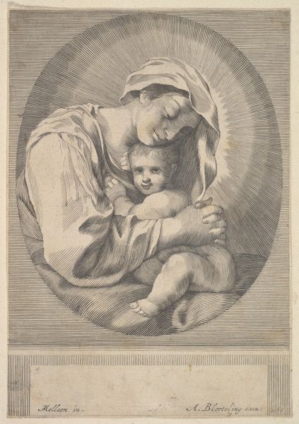 Editor: Here we have Manuel Salvador Carmona’s 1757 engraving, "Maria met het Christuskind," or "Mary with the Christ Child". The piece has a very reverent feel to it, with the Virgin Mary gazing upwards, and Christ looking forward. I'm curious, what are some of the more prominent symbols that stand out to you? Curator: It's fascinating how Carmona uses established visual language here. Note Mary's gaze upwards, toward divine light. This upward direction is a classic visual cue. Her posture evokes humility, acceptance of divine will, doesn’t it? And the child, paradoxically both dependent on Mary and also the source of that very light above? The column behind also signifies strength, steadfastness...almost a support. The composition here is quite revealing, no? What do you see? Editor: I guess I didn’t realize how much the gaze contributes to the narrative! The contrast between Mary's softness and the hard, architectural column is now really noticeable, acting like a firm foundation as you say. Curator: Exactly. Also, observe the swirling clouds in the background; do those shapes and forms evoke a certain mood for you, compared to say, the sharp lines of the engravings in the foreground figures? Editor: Yes, the background clouds make me think of Baroque art, which is all about high drama and movement, but the column and clean lines keep it very formal, like a portrait. It’s almost a meeting of styles to create a highly complex statement! Curator: Precisely. Engravings such as these offered access to devotional imagery across wide audiences – replicating familiar archetypes that have roots far into the medieval past. We begin to comprehend cultural continuity and change, wouldn’t you say? Editor: Absolutely. It is amazing to see how one piece can weave so many art styles together and preserve cultural meaning, all at once.