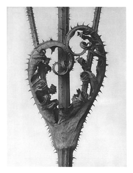 Curator: Here we have Karl Blossfeldt's "Art Forms in Nature 38" from 1928, a silver gelatin print capturing a nascent fern frond. What's your immediate reaction? Editor: I find the subject very vulnerable but also tenacious, unfurling hopefully despite, perhaps, adverse conditions. The tight framing creates an intense focus on the process of growth and resilience. Curator: I see that too. Consider the formal construction: Blossfeldt isolates the fern, stripping it of context. The high contrast, the sharp focus, emphasizes the structural clarity of the plant. Editor: Exactly, the tight cropping against a bright field isolates the fern, suggesting that it is a symbol of hope against a barren backdrop. The high contrast, you mentioned, almost pushes it out, against this negative space. It could be viewed as a microcosm of survival. I mean, at this period, Germany had so much societal imbalance between classes and so much inflation that these conditions bled into many households. Curator: While I concede those potential narratives, I believe Blossfeldt’s motivation leans toward highlighting the inherent artistic forms present in nature, irrespective of external issues. The tightly coiled tip echoes classical architectural details, creating a fascinating juxtaposition of natural and designed structures. Editor: Yes, it does, especially considering the spiral’s mathematical precision—reminiscent of the Fibonacci sequence and how nature uses these principles as fundamental building blocks for creation. Still, the fact it mirrors architectural designs could be viewed as his commentary on the rise of industry and the impact that technology has had on eroding natural form. Curator: Possibly. Blossfeldt’s technical approach is undeniably precise; his utilization of photographic technology transforms natural specimens into almost abstract studies of form. There's a pure, scientific quality that is really very beautiful here. Editor: I can definitely agree with the piece being aesthetically striking, but these pieces reflect, in some ways, a world grappling with a new sense of urgency and despair. I will admit the crisp form provides a striking and timeless portrait of hope. Curator: I appreciate the nuanced lens that you bring; my emphasis tends towards his technique and how his precise framing allows us to see art where we might not otherwise. Editor: And I'm inclined to place it within our world's historical narratives! A constant conversation, perhaps.