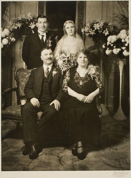 Curator: What strikes me about this vintage photograph, simply called "Untitled," by Martin Schweig, is its dreamlike quality. It’s like stepping into a memory, or perhaps a carefully staged play. Editor: I agree, there's a performative aspect to it. The backdrop with the flowers and candelabras certainly tells a story, maybe of prosperity, or perhaps of constructed notions of class and gender roles within marriage? Curator: Absolutely. Their poses are so studied, so self-aware. It makes you wonder about the power dynamics at play. What were the expectations, the societal scripts they were enacting? The veil, the carefully folded gloves... Editor: The woman's dress, fitted yet demure, speaks volumes about the era’s expectations for women—a subtle constriction. The flowers, while beautiful, almost feel like a gilded cage, don't they? Curator: Yes, the setting does frame them in a way that suggests both celebration and constraint. It's beautiful, though, isn’t it? The light, the texture... it's really captivating. Editor: It certainly makes you ponder the narratives we create and the roles we play, both then and now. It is definitely a powerful, nuanced depiction of a couple caught between societal expectations and personal desires. Curator: A fascinating intersection of the personal and the performative, immortalized in this single frame.